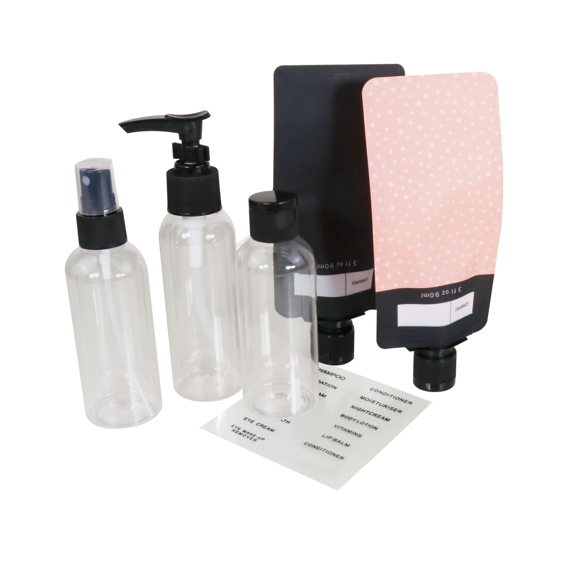 • Set includes: 1 x 100ml pump bottle, 1 x 100ml spray bottle, 1 x 100ml flip bottle, 2 x 90ml each pet bags, 1 sheet of clear sticker labels