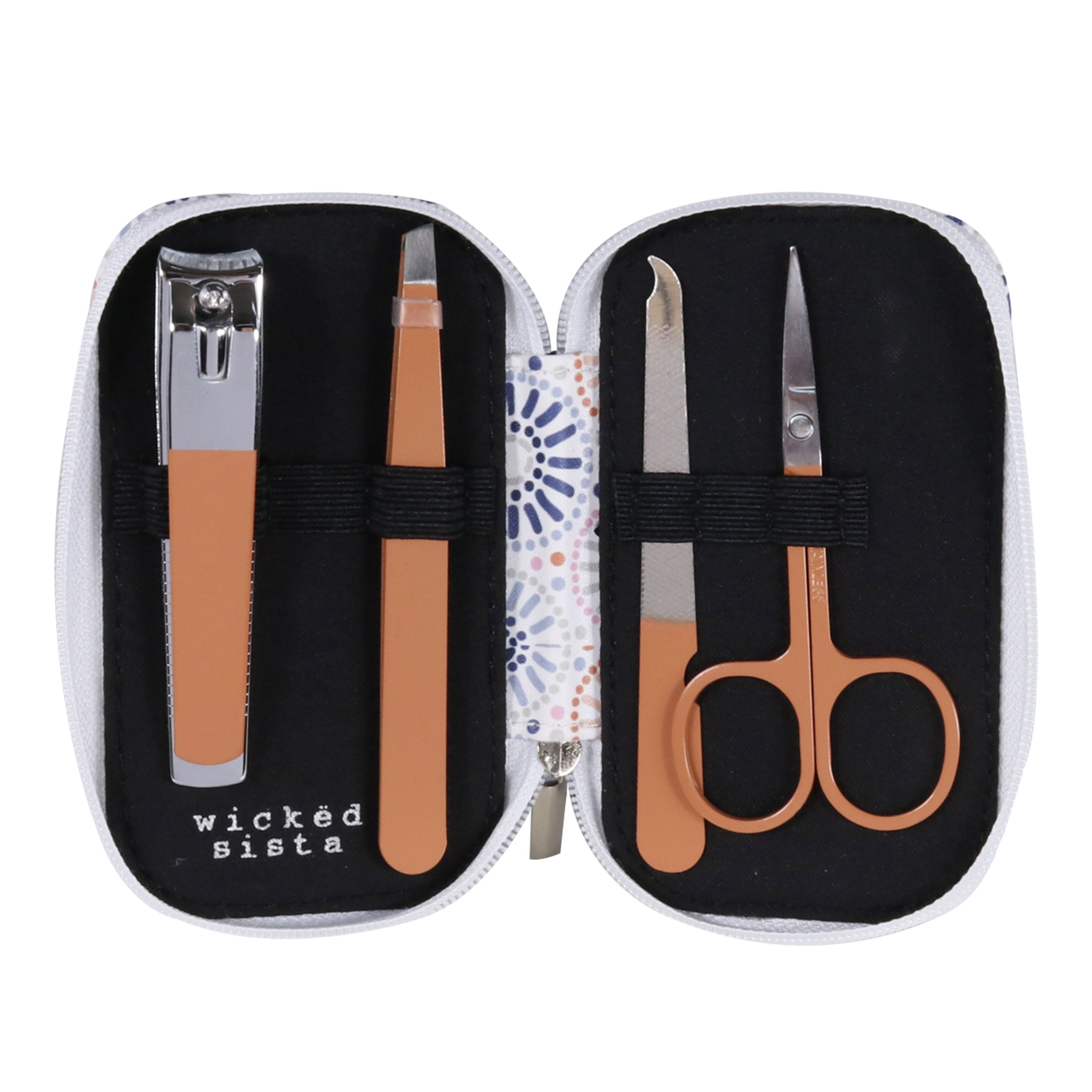 • Contains: stainless steel nail scissors, stainless steel nail file, stainless steel tweezers and nail clipper.