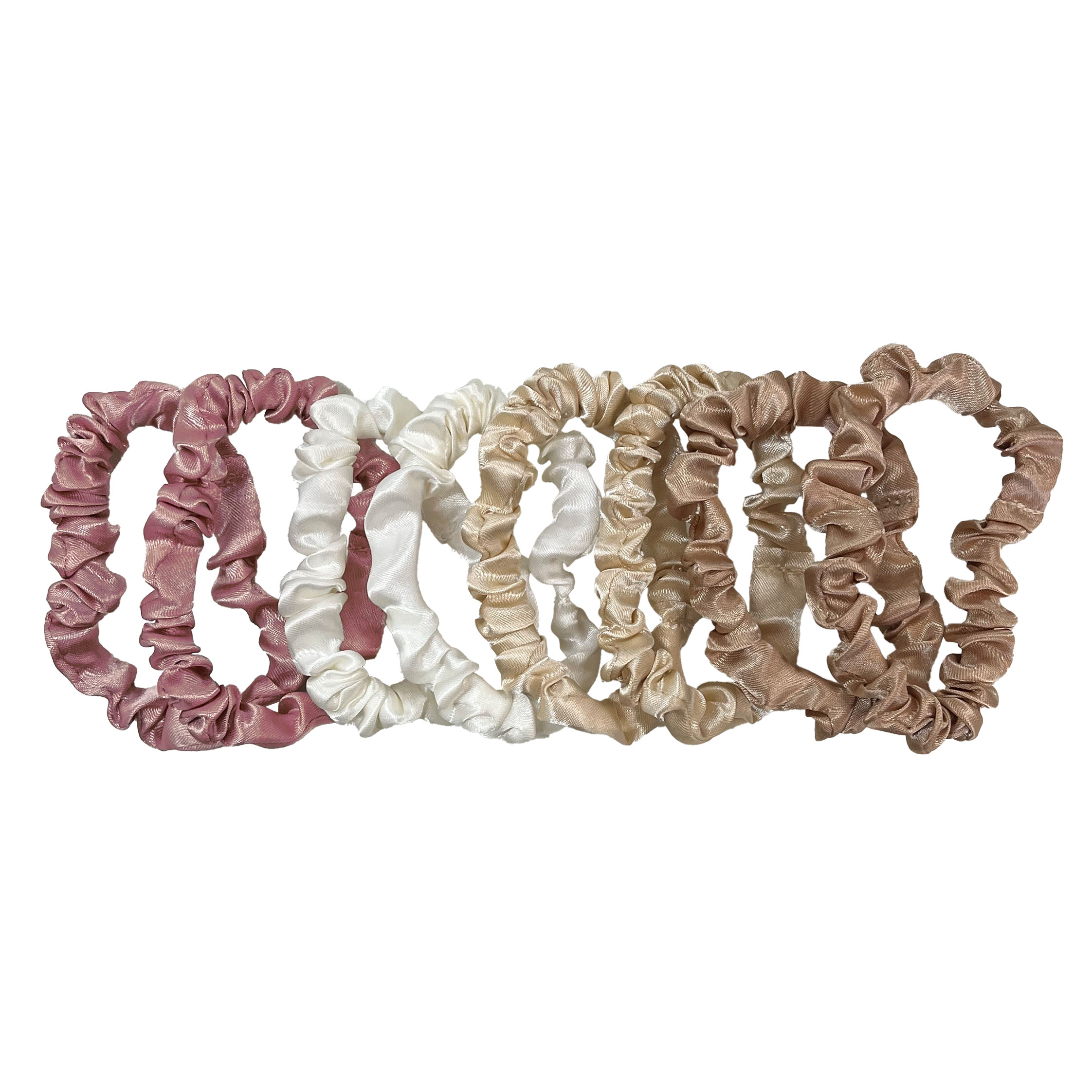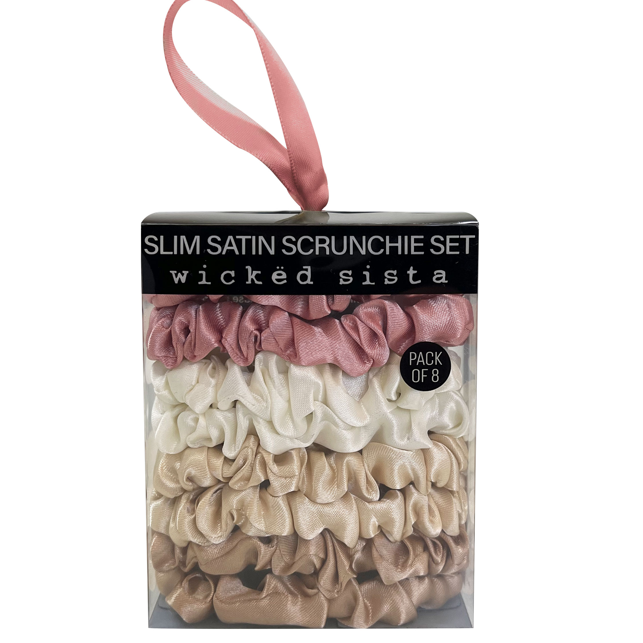 Set of 8 slim satin scrunchies, each 1cm wide. Ultra soft texture that is extra smooth and gentle on hair. Minimises tangles, creases & frizz.