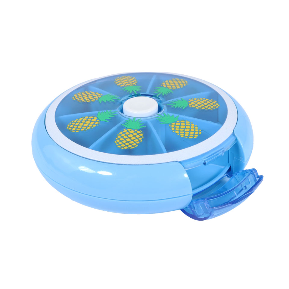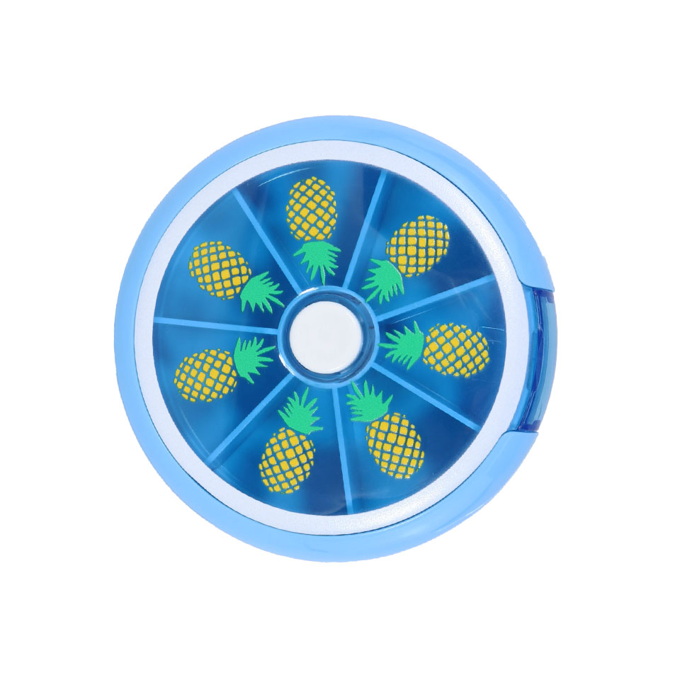 Cute and practical! These fruit pill cases are an easy to use push and turn case. Simply press the white button in the middle and the case turns to open your daily pill allotment. It has 7 compartments for a weeks supply. Organised and cute!
