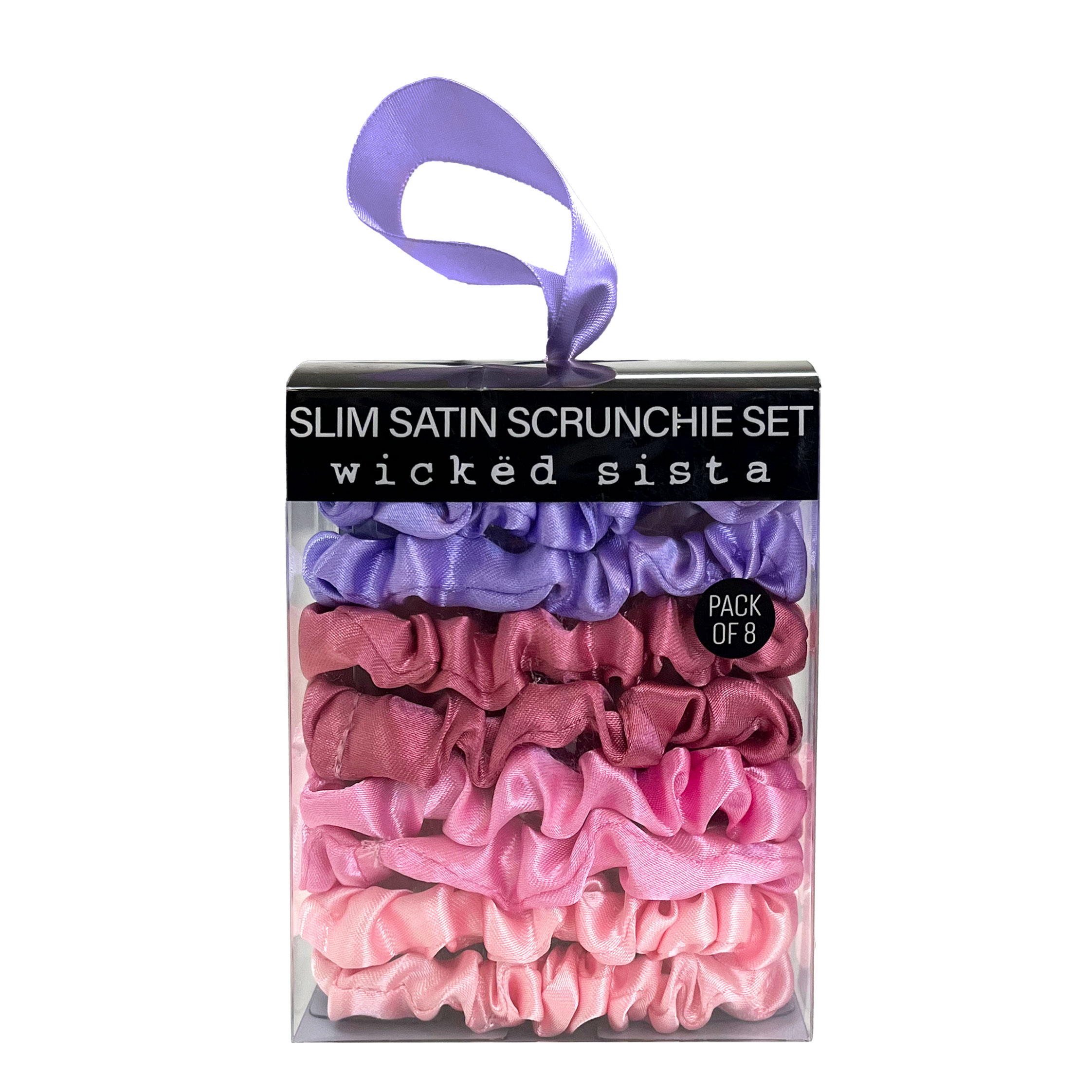 Set of 8 slim satin scrunchies, each 1cm wide. Ultra soft texture that is extra smooth and gentle on hair. Minimises tangles, creases & frizz.