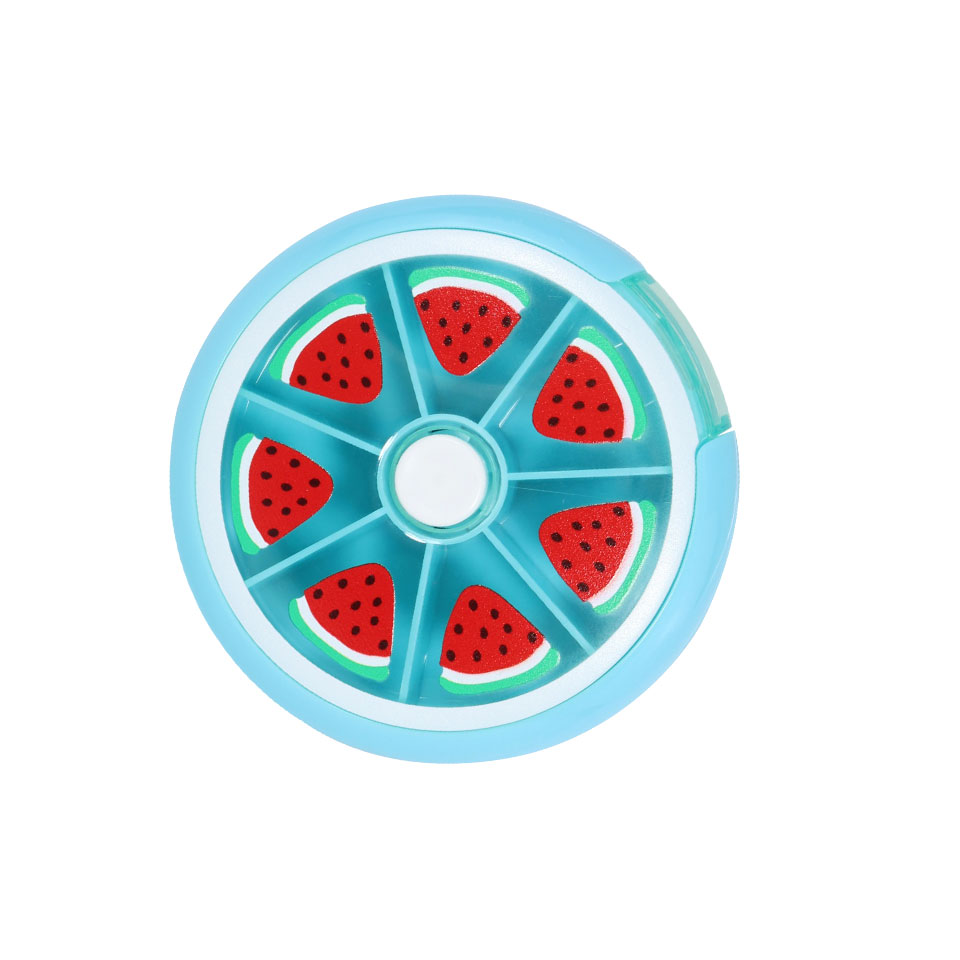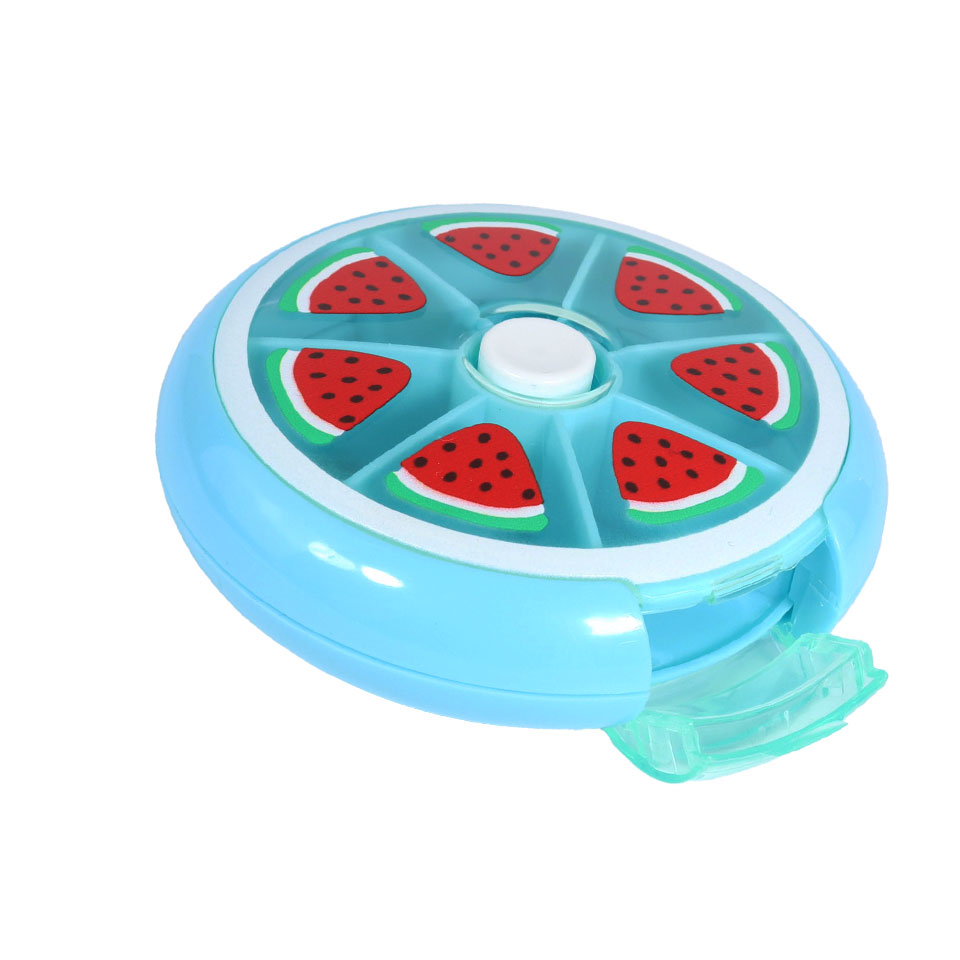 Cute and practical!  These fruit pill cases are an easy to use push and turn case.  Simply press the white button in the middle and the case turns to open your daily pill allotment. It has 7 compartments for a weeks supply. Organised and cute!